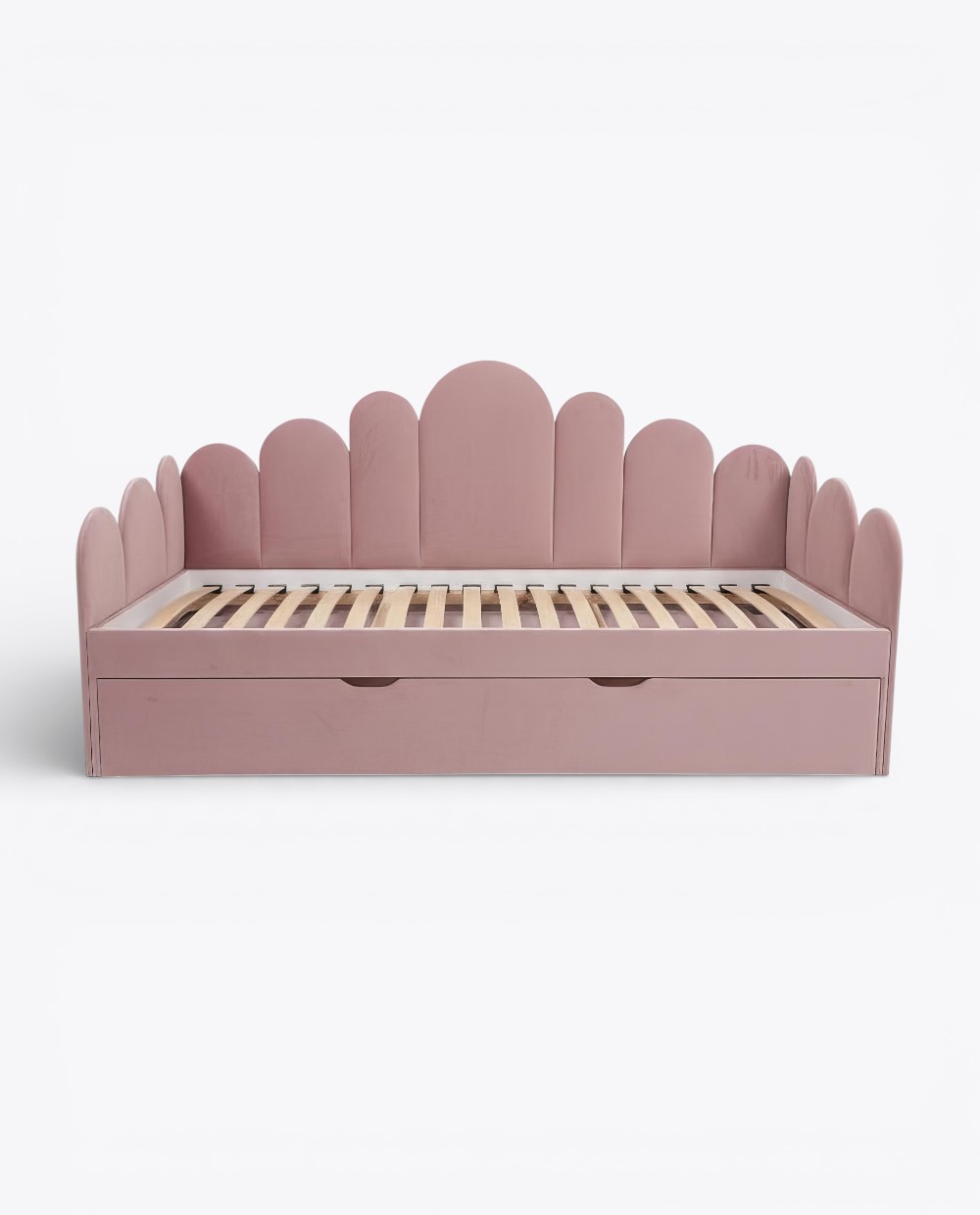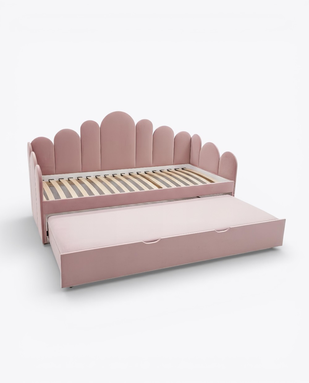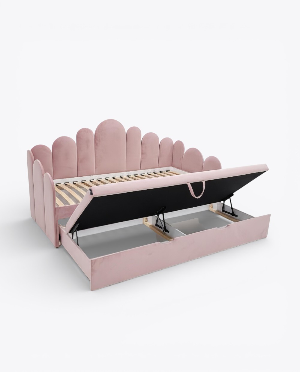 Dodatkowa powierzchnia spania wysuwana na gumowych rolkach umożliwia komfortowe nocowanie drugiej osoby, a pojemnik pozwala na wygodne przechowywanie pościeli, koca lub zabawek.