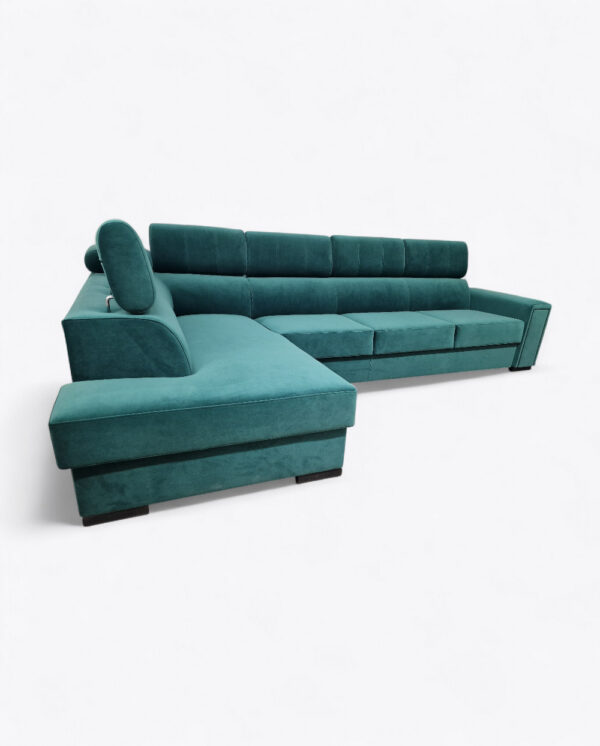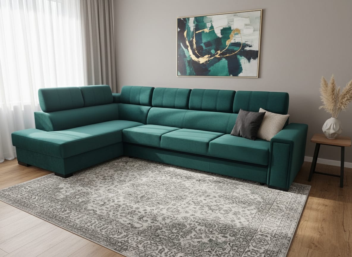 Stelaż narożnika wykonany z drewna litego i płyty meblowej, sprężyny falistej oraz wysokiej gęstości pianki HR.