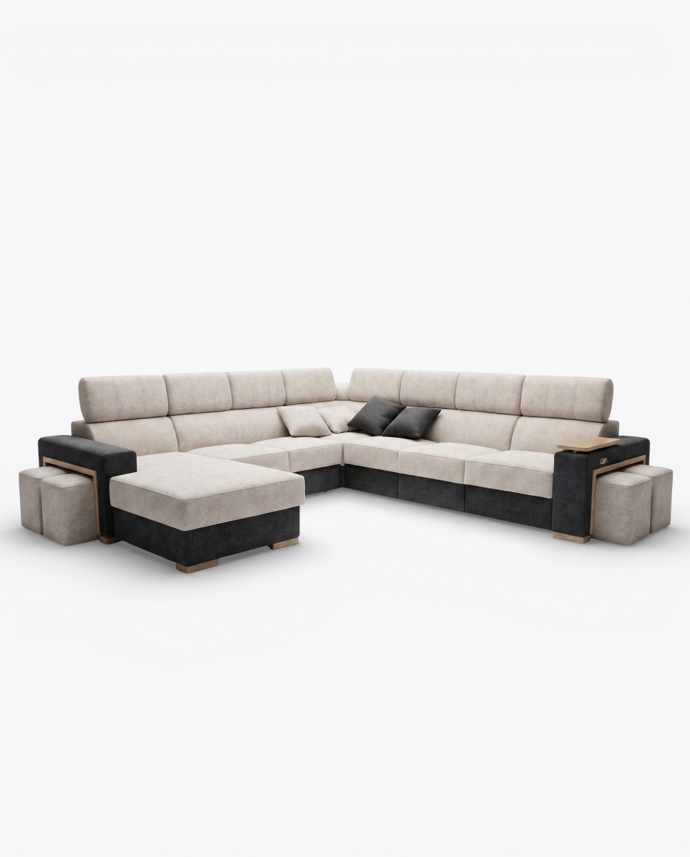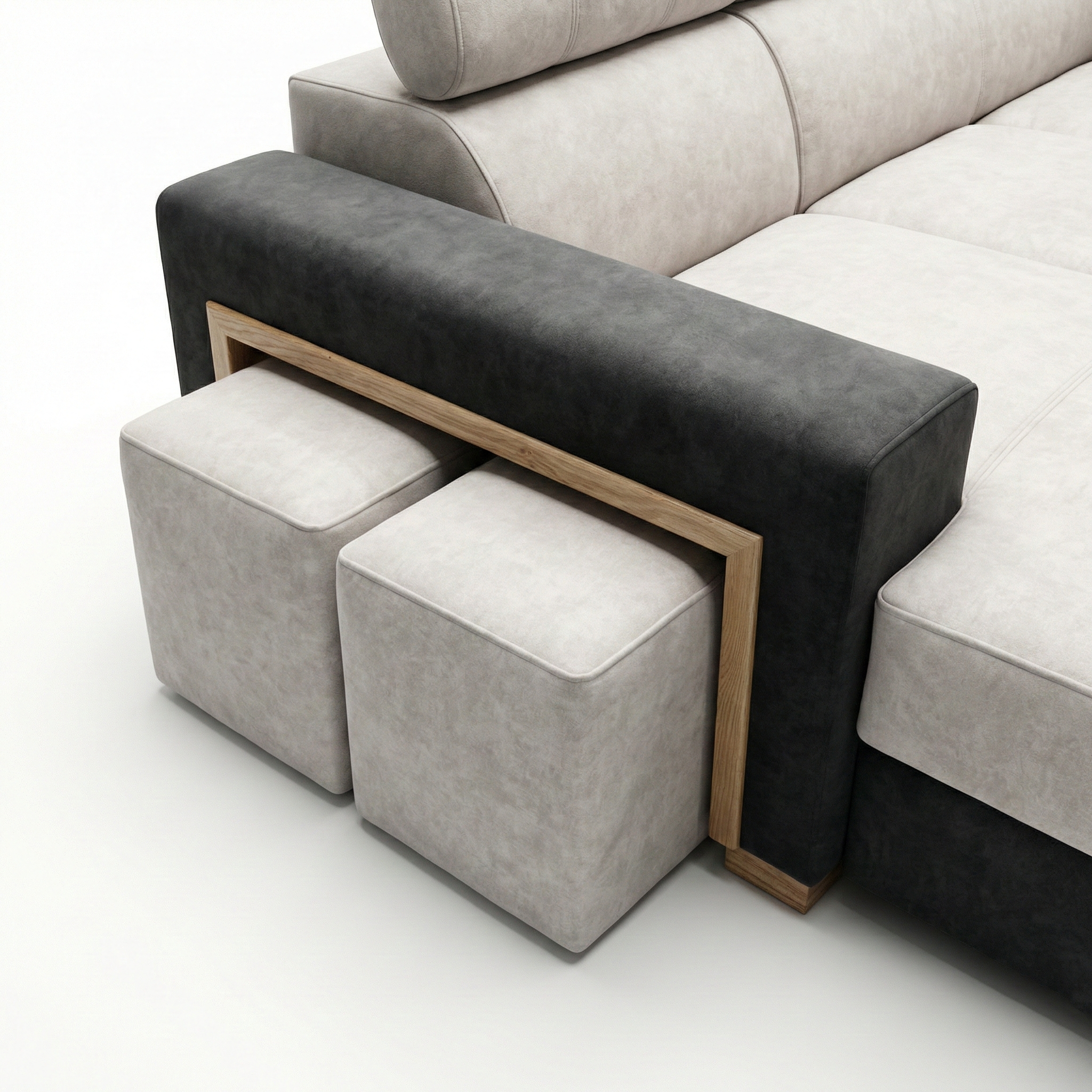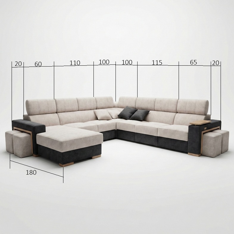 Narożnik wyposażono w pufy z ozdobną ramką, które stanowią zarówno element dekoracyjny jak i funkcjonalny. Starannie zaprojektowane detale nadają bryle elegancki, nowoczesny wygląd.