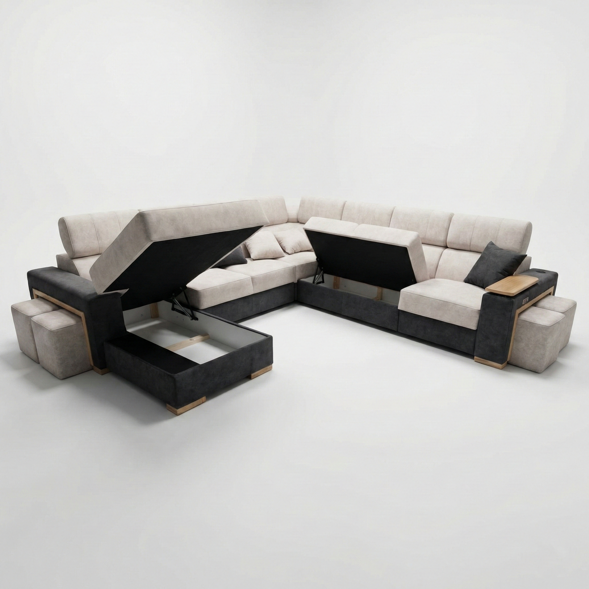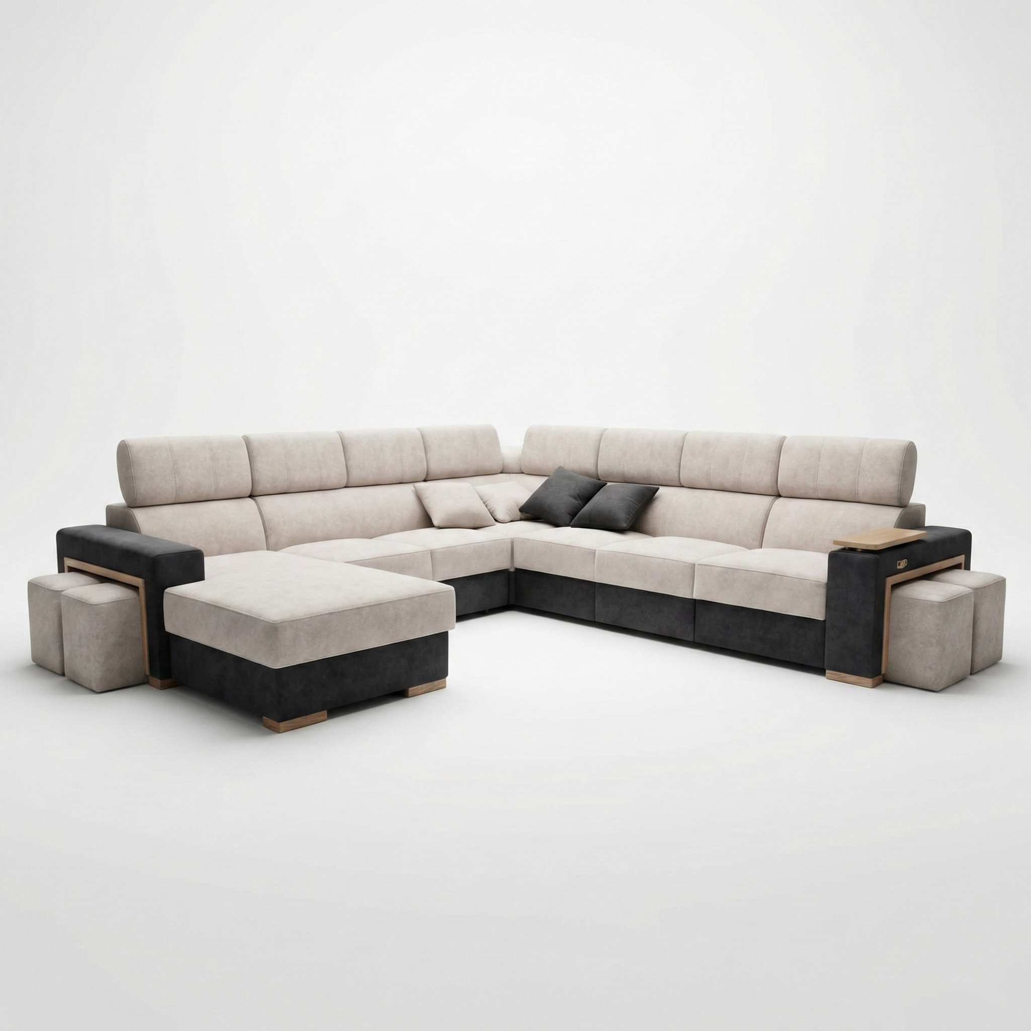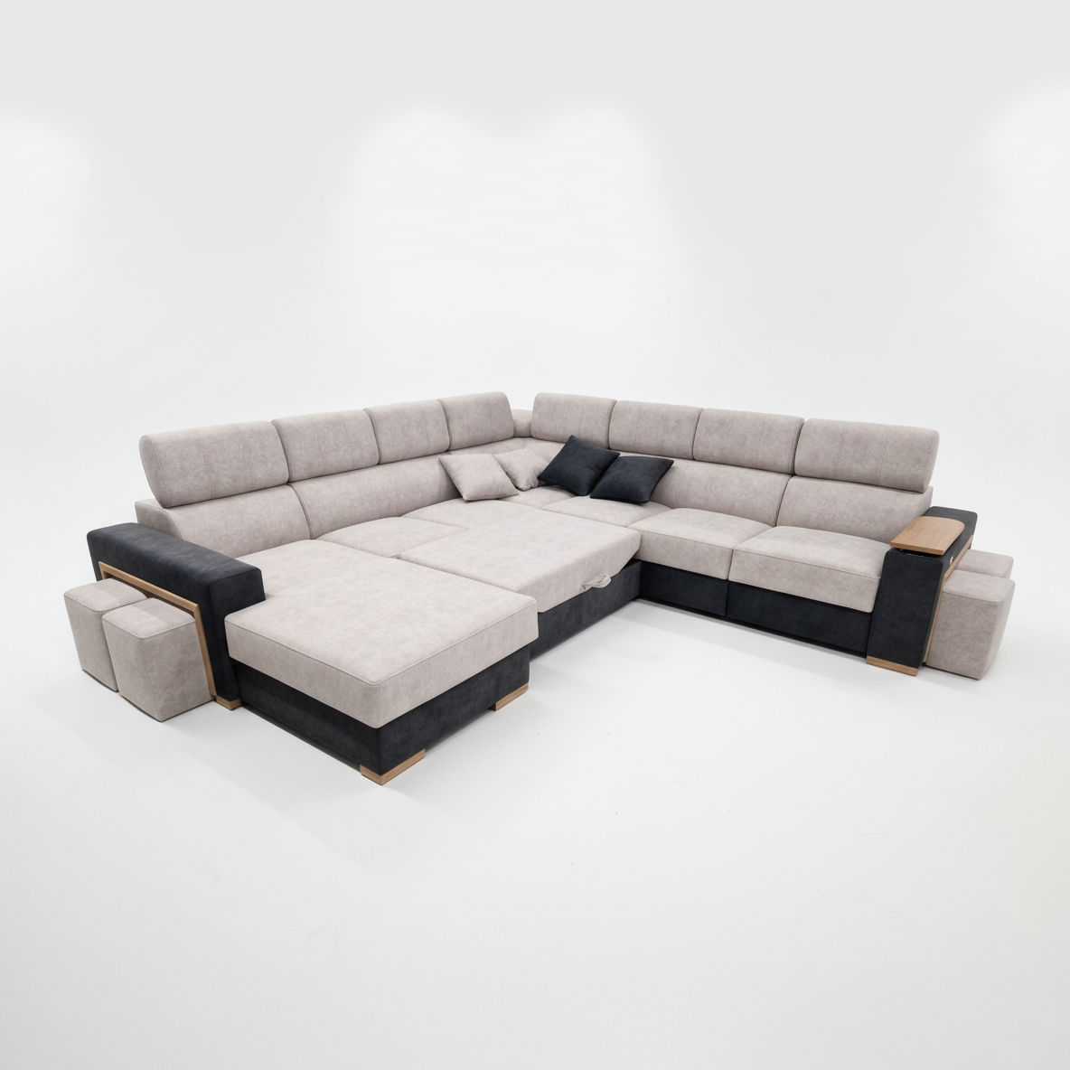 Narożnik wyposażono w pufy z ozdobną ramką, które stanowią zarówno element dekoracyjny jak i funkcjonalny. Starannie zaprojektowane detale nadają bryle elegancki, nowoczesny wygląd.