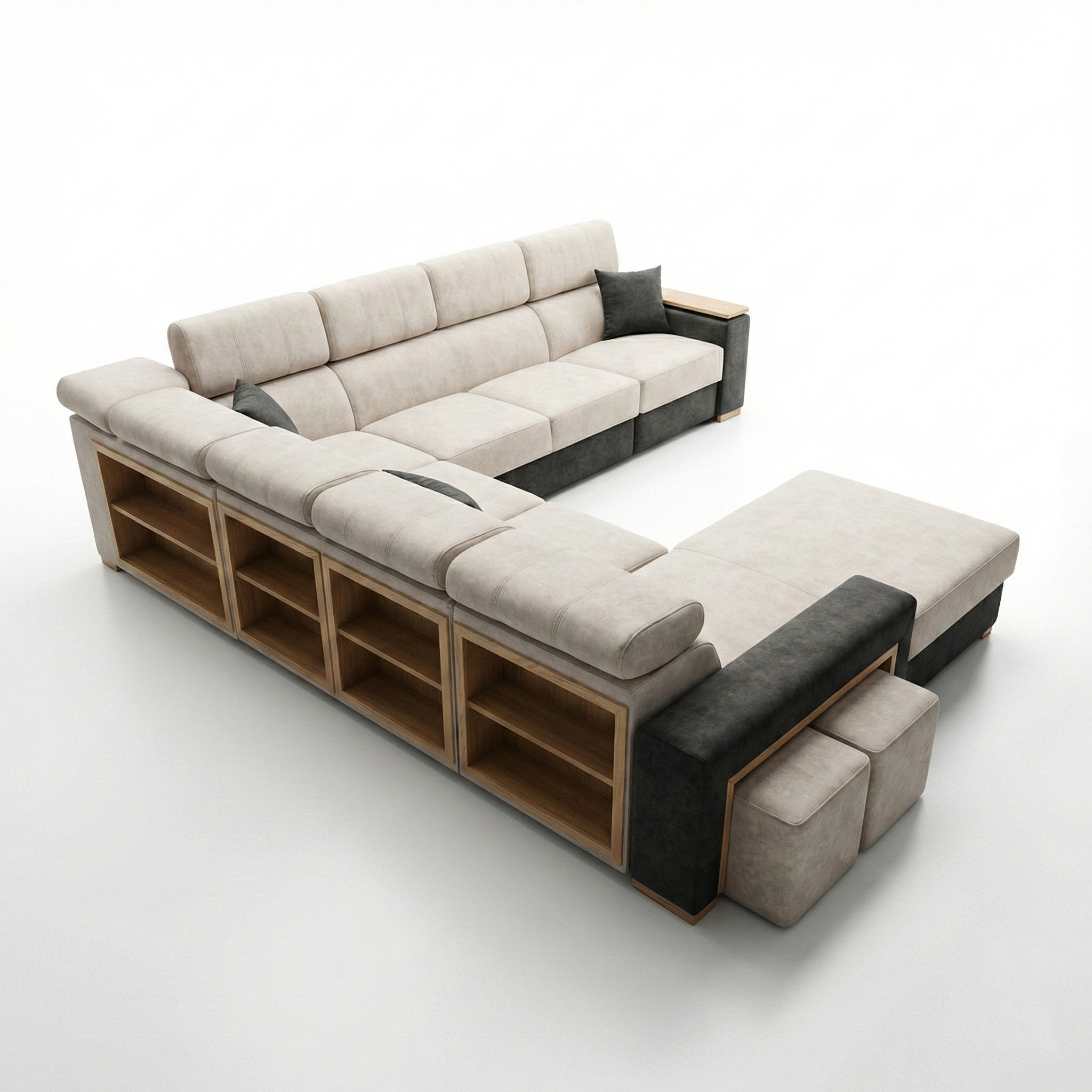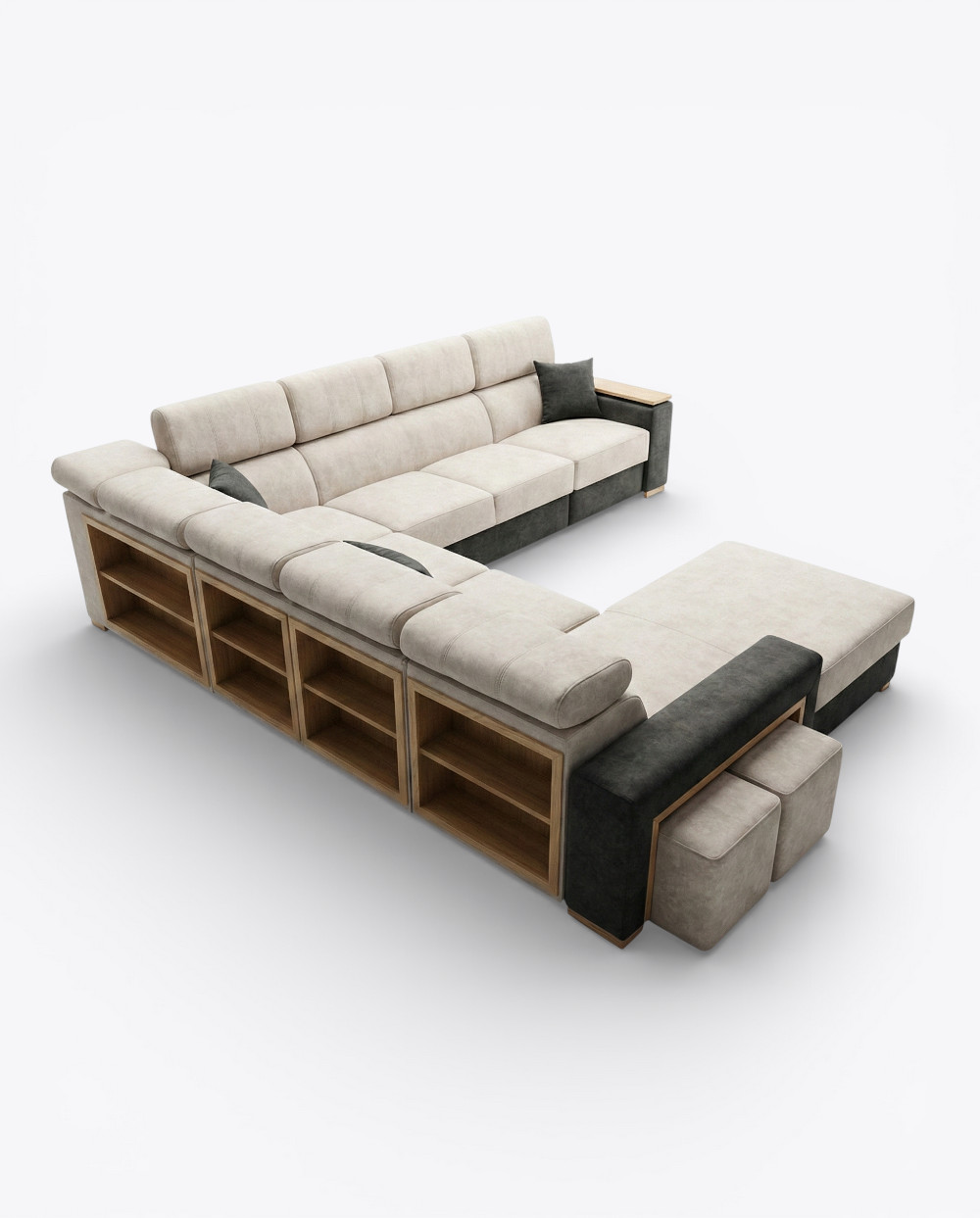 Na plecach narożnika znajdują się praktyczne półki wykończone fornirem, idealne do przechowywania lub ekspozycji dodatków, książek czy dekoracji.