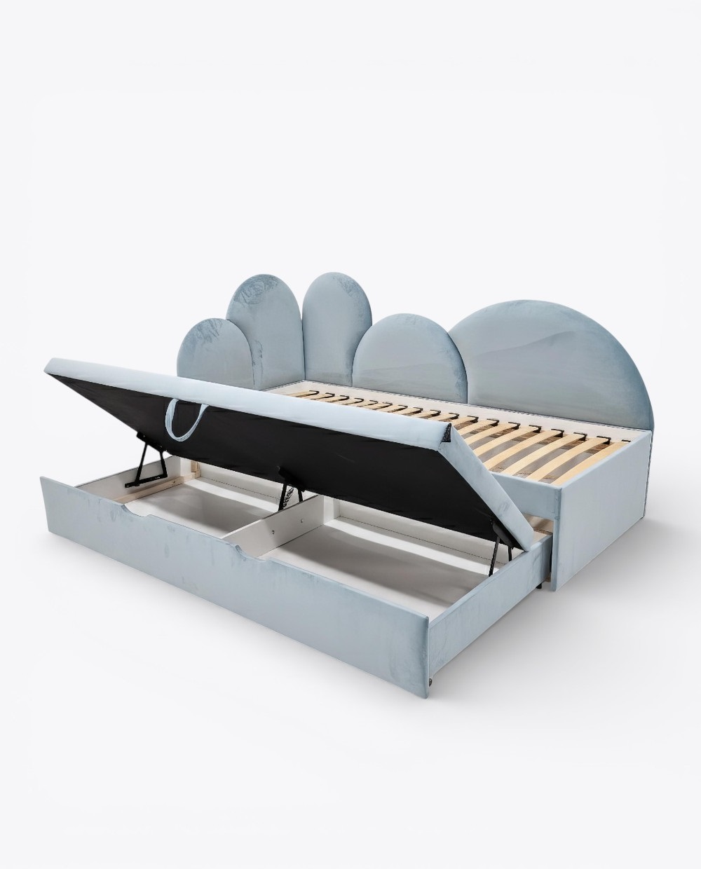 Tapicerowane boki oraz wezgłowie wykonane z miękkiego weluru Piano 11 są przyjemne w dotyku i bezpieczne w użytkowaniu. Stabilna konstrukcja oparta na płycie laminowanej oraz litym drewnie sosnowym gwarantuje trwałość i komfort na lata.