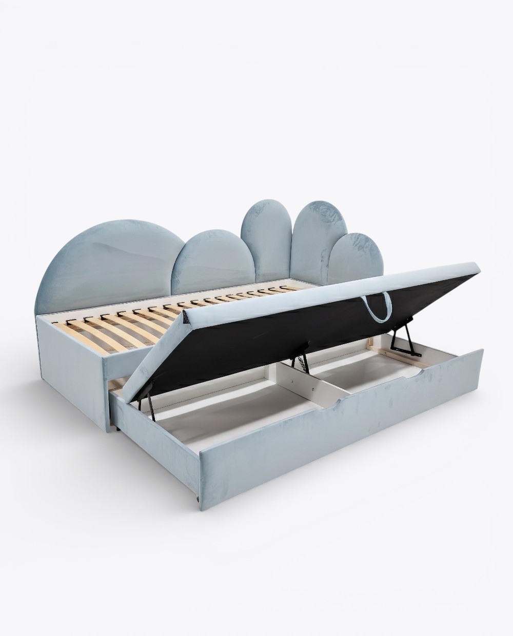 Tapicerowane boki oraz wezgłowie wykonane z miękkiego weluru Piano 11 są przyjemne w dotyku i bezpieczne w użytkowaniu. Stabilna konstrukcja oparta na płycie laminowanej oraz litym drewnie sosnowym gwarantuje trwałość i komfort na lata.