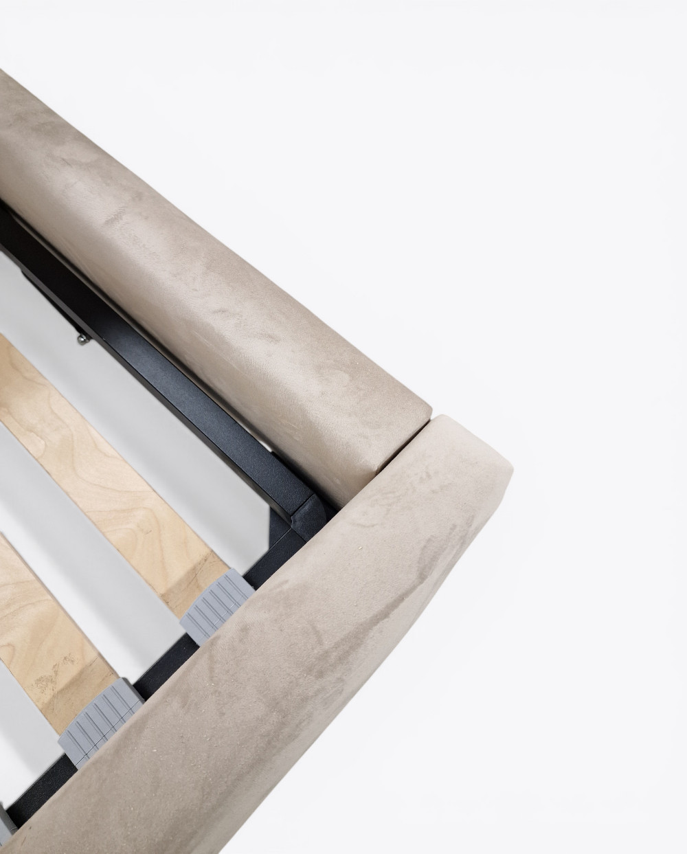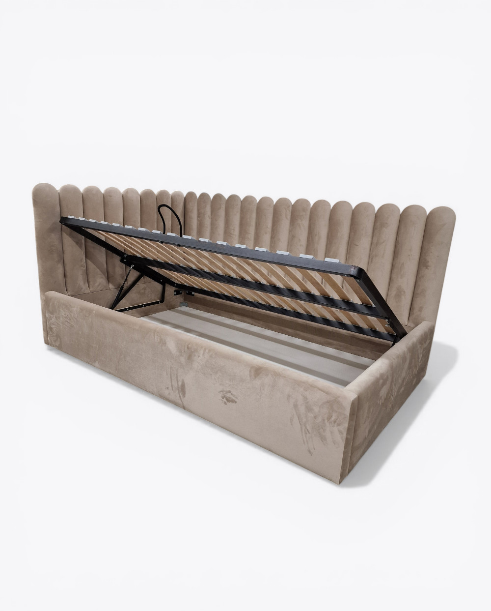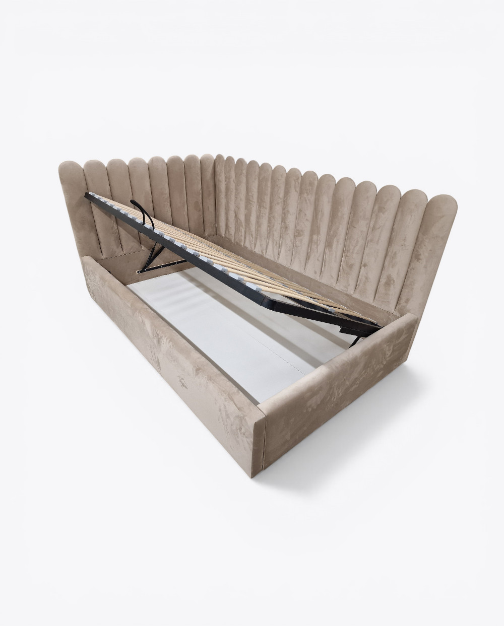 Model ŁUKI wyposażony jest w praktyczny pojemnik na pościel, otwierany za pomocą podnośników gazowych. Mechanizm działa lekko i bezpiecznie, ułatwiając codzienne korzystanie ze schowka. To idealne miejsce na pościel, koce, sezonowe ubrania lub inne rzeczy, które warto mieć pod ręką.