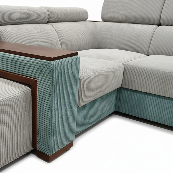Stelaż narożnika wykonany z drewna litego i płyty meblowej, sprężyny falistej oraz wysokiej gęstości pianki HR.