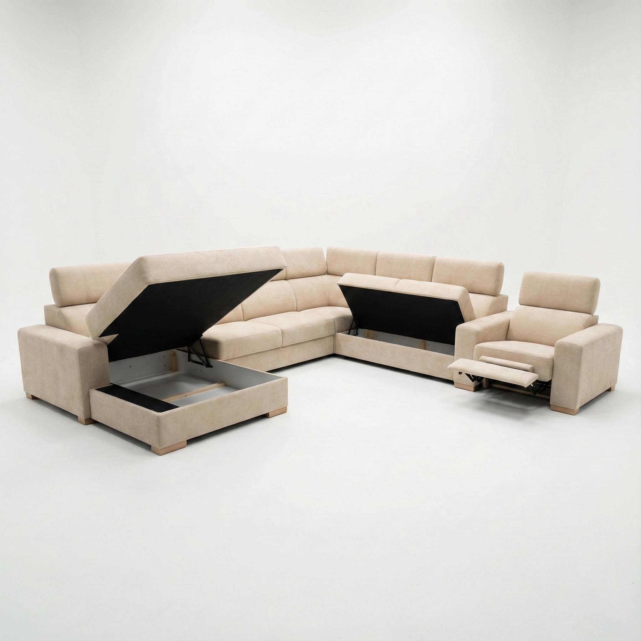 Narożnik wyposażono w dwa pojemniki na pościel, które pomieszczą kołdry, poduszki i inne tekstylia, pomagając utrzymać porządek w salonie. Solidne wykonanie, staranne wykończenie i uniwersalna kolorystyka sprawiają, że narożnik pasuje zarówno do nowoczesnych, jak i klasycznych wnętrz.